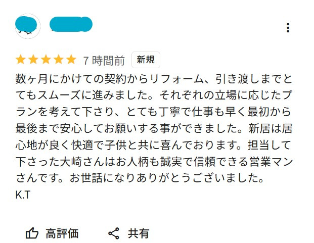 数ヶ月にかけての契約からリフォーム、引き渡しまでとてもスムーズに進みました。それぞれの立場に応じたプランを考えて下さり、とても丁寧で仕事も早く最初から最後まで安心してお願いする事ができました。新居は居心地が良く快適で子供と共に喜んでおります。担当して下さった大崎さんはお人柄も誠実で信頼できる営業マンさんです。お世話になりありがとうございました。