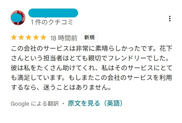 この会社のサービスは非常に素晴らしかったです。花下さんという担当者はとても親切でフレンドリーでした。彼は私をたくさん助けてくれ、私はそのサービスにとても満足しています。もしまたこの会社のサービスを利用するなら、迷うことはありません。